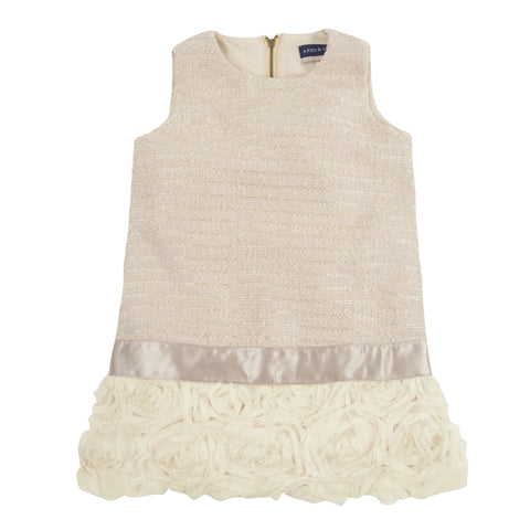 Beauty is in bloom with this stunning tweed dress with lurex thread, satin ribbons, and a hem of rosettes. Be the centerpiece of any occasion this season.